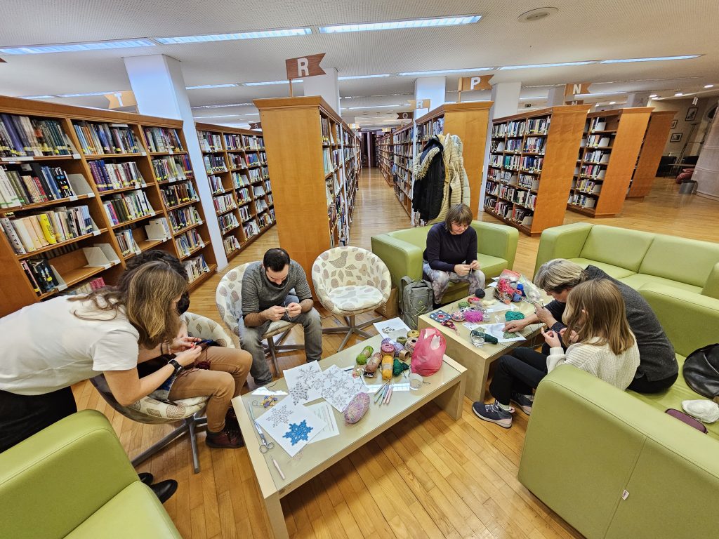 V preteklem tednu smo se v prijetnem in ustvarjalnem vzdušju Oddelka za odrasle posvetili kvačkanju novoletnih okraskov. Nekateri udeleženci so se s kvačko šele spoznavali in osvajali osnovne vozle ter prijeme, medtem ko so izpod rok izkušenih Mestnih kvačkaric nastajale prave male mojstrovine. Z njimi smo še dodatno polepšali našo novoletno smrečico v preddverju knjižnice.