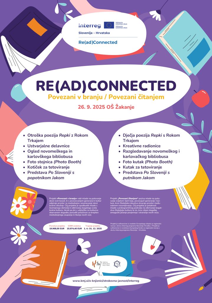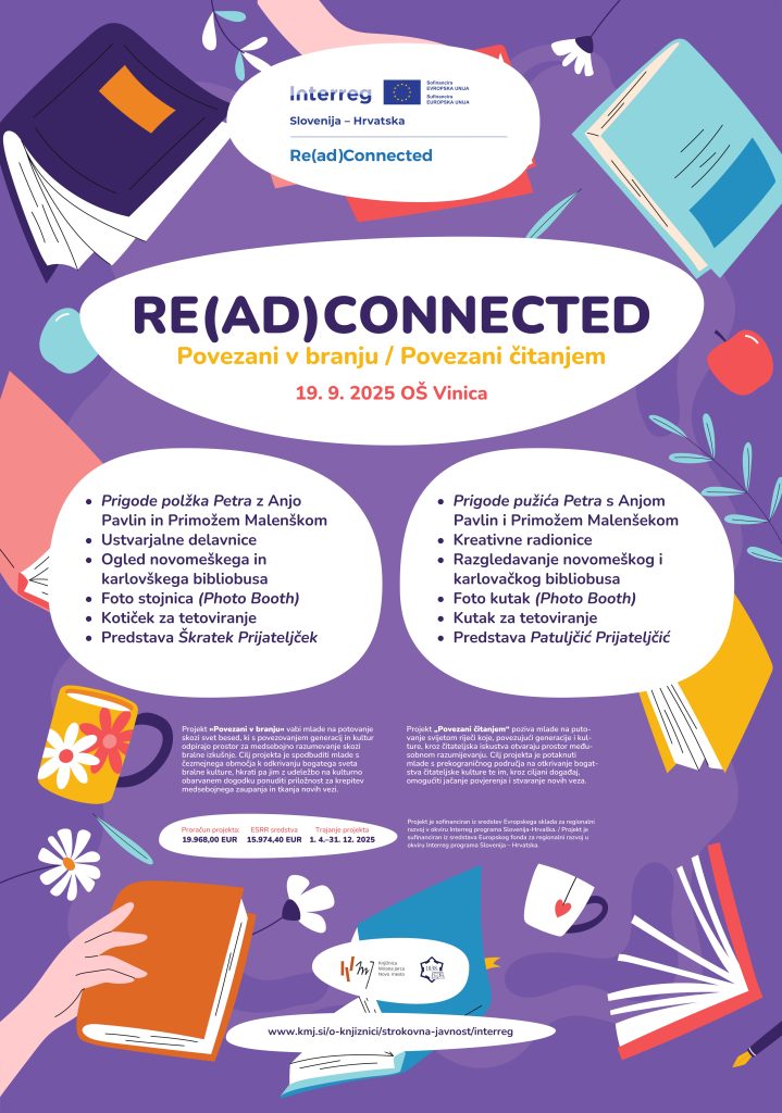 Knjižnica Mirana Jarca Novo mesto v okviru evropskega projekta Povezani v branju (Re(ad)Connected), v sodelovanju s partnersko knjižnico iz Karlovca (Mestna knjižnica “Ivan Goran Kovačić” Karlovec), pripravlja dva dogodka za osnovnošolce.