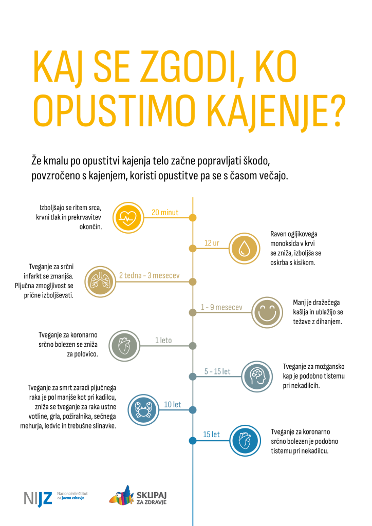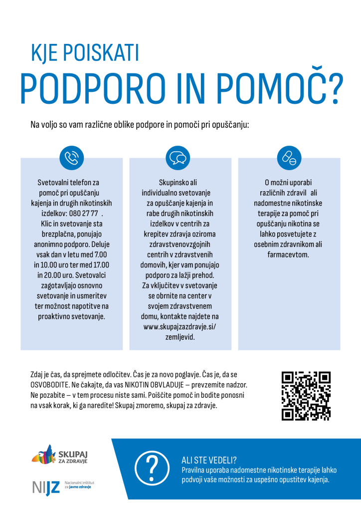 Na Nacionalnem inštitutu za javno zdravje ugotavljajo, da več kot polovica kadilcev želi prenehati s kajenjem, veliko jih v prvih nekaj poskusih ni uspešnih, zato vsem, ki si želijo opustiti to škodljivo razvado svetujejo, naj pomoč poiščejo preko svetovalnega telefona ali v bližnjem zdravstvenem domu, kjer Centri za krepitev zdravja oz. Zdravstveno-vzgojni centri ponujajo brezplačno skupinsko in individualno svetovanje za opuščanje kajenja. Prav tako brezplačna je pomoč na svetovanem telefonu, kjer svetovanje izvajajo usposobljeni svetovalci. Telefonska številka svetovalne linije, 080 27 77, je objavljena na vseh embalažah tobačnih izdelkov. »Na tej telefonski številki lahko vsakdo pridobi potrebne informacije o opuščanju oziroma se dogovori za pomoč pri opuščanju preko telefona. Telefon deluje vsak dan, tudi med vikendi in prazniki, med 7. in 10. uro ter med 17. in 20. uro.Preko te številke je možno tudi proaktivno telefonsko svetovanje svetovalca, ki je namenjeno podpori, preprečevanju ponovne rabe nikotinskega izdelka in reševanju trenutnih težav, je povedal dr. Tomaž Čakš z NIJZ in dodal, da svetovalci na leto sprejmejo med 350 in 600 klicev. Ob tem je poudaril: »Kdor je zasvojen, ni svoboden. Zato je pomembno, da se reši iz kletke zasvojenosti in se osvobodi«.