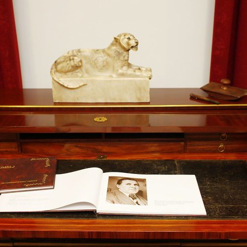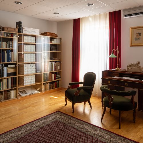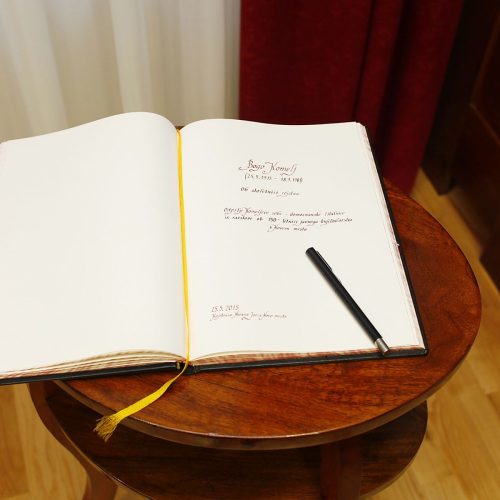 Ko vstopimo vanj, se zdi, kot da smo se vrnili v preteklost … Kot da bomo vsak hip v tej sobi ugledali moža, ki si je s takšnim žarom prizadeval za vzpostavitev sodobne knjižnice po koncu druge svetovne vojne ter za ohranjanje in urejanje raznovrstne kulturne dediščine, od grajskega in spominskega pohištva znamenitih Slovencev, portretov slovenskih pisateljev, njihovih rokopisov in predmetov, prvih knjižnih izdaj, faksimilov, ekslibrisov in še in še.  Ampak za njegovo pisalno mizo nihče ne sedi, njegova aktovka je ves čas prislonjena ob mizo, nekoč glasni Komeljev pisalni stroj je že davno utihnil. In tudi ti predmeti so postali dragoceni spominski eksponati, del posebnih zbirk, na katere smo v knjižnici še posebej ponosni in jih želimo pokazati našim obiskovalcem in uporabnikom.